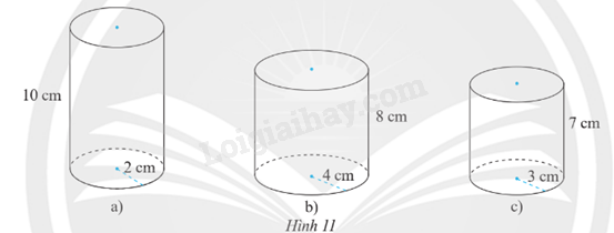 Tìm chiều cao, bán kính đáy và diện tích xung quanh, thể tích của mỗi hình trụ sau: