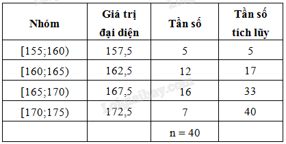 \(\bar x = \frac{{157,5.5 + 162,5.12 + 167,5.16 + 172,5.7}}{{40}} \approx 165,6\left( {{\rm{cm}}} \right).\)
