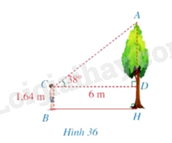 Để ước lượng chiều cao của một cây trong sân trường, bạn Hoàng đứng ở sân trường (theo phương thẳng đứng), mặt bạn Hoàng đặt tại vị trí (C) cách mặt đất một khoảng (CB = DH = 1,64m) và cách cây một khoảng (CD = BH = 6m). Tính chiều cao (AH) của cây (làm tròn kết quả đến hàng phần trăm của mét), biết góc nhìn (ACD) bằng (38^circ ) minh họa ở Hình 36.