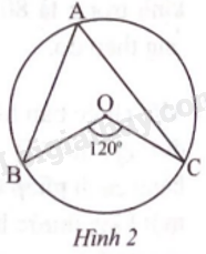 Ta có \(\widehat{BAC}=\frac{1}{2}sđ\overset\frown{BC}=\frac{1}{2}\widehat{BOC}=\frac{1}{2}{{.120}^{o}}={{60}^{o}}\).