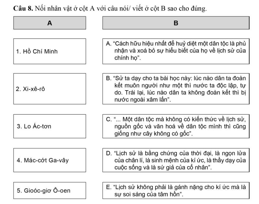 Từ hiểu biết của bản thân và kiến thức có được, ta có thể ghép các nhân vật ở cột A đúng với các câu nói ở cột B như sau: