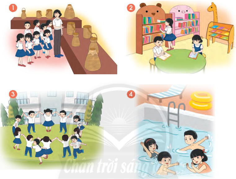 Tranh 4: Các bạn học sinh đang bơi ở hồ bơi.