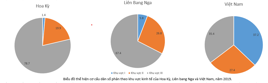 Hoa Kì dân số làm việc chủ yếu tại khu vực III (78,7%) cao gấp 2,2 lần so với dân số làm việc trong khu vực III của Việt Nam, ngược lại tại Việt Nam tỉ lệ dân làm việc khu vực I còn rất cao (37,2%) gấp 26,6 lần Hoa Kì và 6,4 lần Liên Bang Nga.