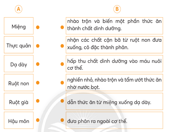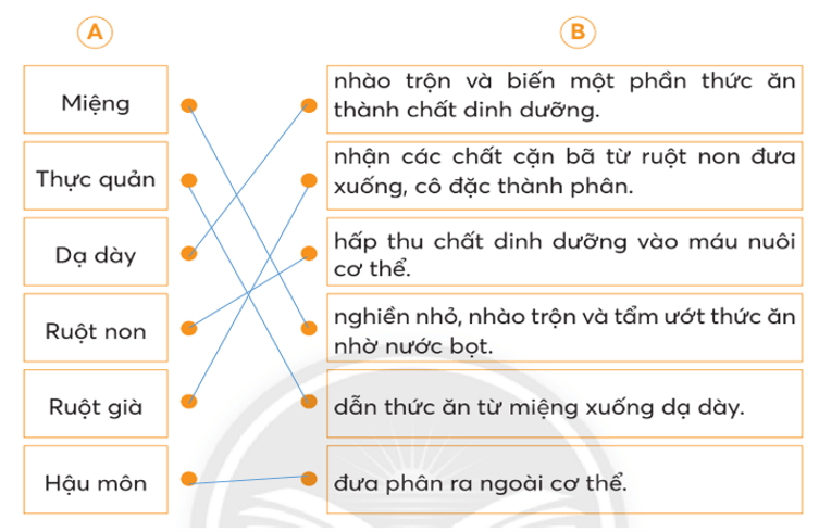 Nối tên các bộ phận ở cột A với chức năng ở cột B sao cho phù hợp.