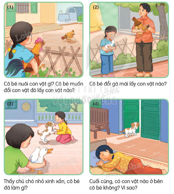 - Tranh 1: Cô bé nuôi một chú gà trống. Cô muốn đổi gà trống lấy gà mái