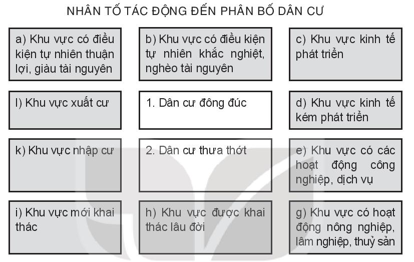 - Dựa vào kiến thức đã học về các nhân tố tác động đến sự phân bố dân số để nối cho phù hợp