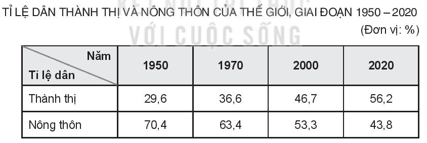 - Vẽ biểu đồ thể hiện sự thay đổi tỉ lệ dân thành thị và nông thôn thế giới giai đoạn 1950 – 2020.