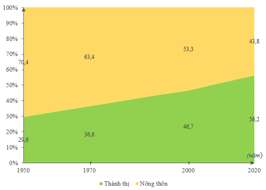 - Năm 2020, tỉ lệ dân nông thôn chỉ đạt 43,8%, giảm 26,6% so với năm 1950.