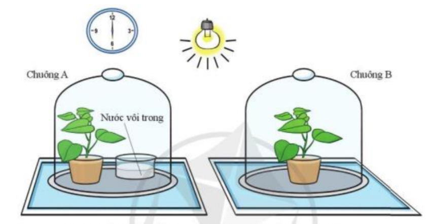 Xử lí cây thí nghiệm, loại bỏ hoàn toàn tinh bột khỏi lá cây (để chậu cây vào chỗ tối 3-4 ngày). Việc đặt cốc nước vôi trong vào chuông A nhằm hấp thụ hết lượng carbon dioxide (CO2) có trong không khí trong chuông A.