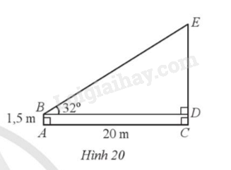 Người đó nhìn lên đỉnh cột cờ (ở vị trí E) theo phương BE tạo với phương nằm ngang BD một góc là \(\widehat {EBD} = 32^\circ \) (Hình 20). Tính chiều cao của cột cờ (làm tròn kết quả đến hàng đơn vị của mét).