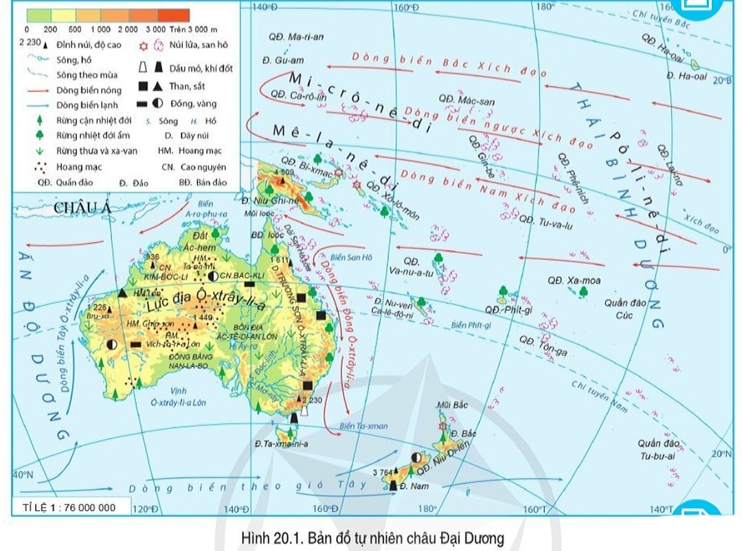 Đọc thông tin mục “Đặc điểm thiên nhiên của các đảo, quần đảo và lục địa Ô-xtrây-li-a” và quan sát hình 20.1.