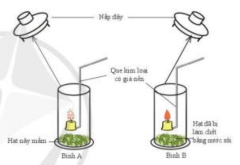 - Bình A (hạt sống): Khi đưa cây nến đang cháy vào nến bị dập tắt. Do bình A hạt mầm diễn ra quá trình hô hấp tế bào, hạt mầm lấy oxygen (chất duy trì sự cháy) từ môi trường và thải khí carbon dioxide.