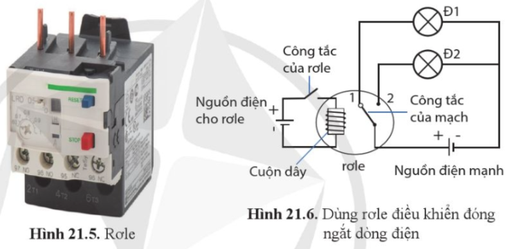 Biết mạch điện dùng rơ-le ở hình 21.6 hoạt động theo cách sau: Khi đóng hoặc mở công tắc của rơ-le thì sẽ có dòng điện chạy qua cuộn dây của rơ-le, cuộn dây này sẽ đóng hay mở công tắc của mạch điện dùng đèn ở vị trí 1 hoặc 2. Hãy mô tả hoạt động của mạch điện khi rơ-le đóng công tắc mạch ở vị trí 1 và vị trí 2.