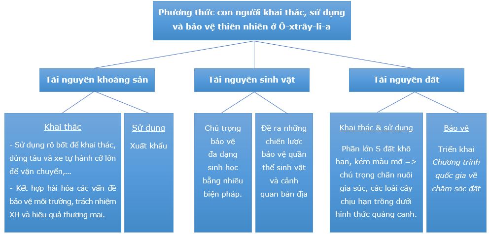 Sơ đồ các phương thức con người khai thác, sử dụng và bảo vệ thiên nhiên ở Ô-xtrây-li-a cần thể hiện được: