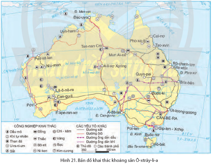 - Các khoáng sản chính được khai thác ở Ô-xtrây-li-a: than đá, u-ra-ni-um, ni-ken, chì, bô-xít, đồng, vàng, sắt, kim cương, dầu mỏ, khí tự nhiên,…