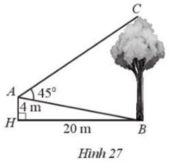 Một người đứng ở vị trí Atrên nóc một ngôi nhà cao 4 m đang quan sát đang quan sát một cây cao cách ngôi nhà 20 m và đo được \(\widehat {BAC} = {45^0}\) (Hình 27). Tính chiều cao của cây đó (làm tròn kết quả đến hàng phần mười theo đơn vị mét)