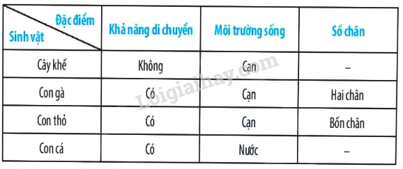 Cho một số sinh vật sau: cây khế, con gà, con thỏ, con cá. Em hãy xác định các đặc điểm đối lập và xây dựng khóa lưỡng phân phân loại các sinh vật trên.