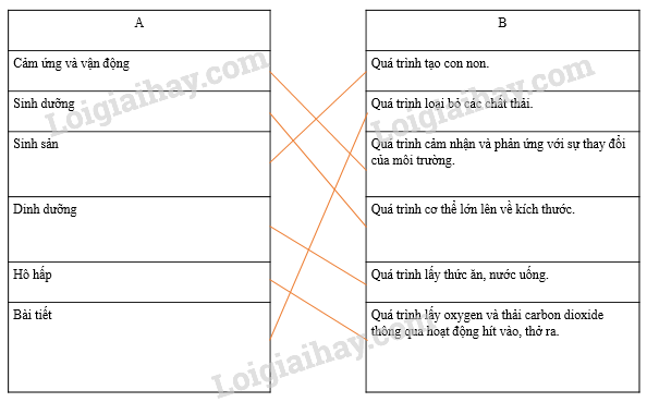 Hoàn thành các quá trình sống sơ bản còn thiếu ở cột A và nối với nội dung ở cột A với cột B cho phù hợp.