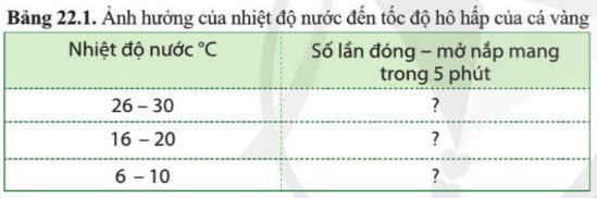 Tìm hiểu thêm Thí nghiệm: Ảnh hưởng của nhiệt độ nước đến tốc độ hô hấp của cá vàng. Bằng cách đếm số lần đóng - mở nắp mang của cá vàng/ phút ở các nhiệt độ nước khác nhau ta có thể biết được ảnh hưởng của nhiệt độ lên hô hấp của cá vàng. Hãy tiến hành thí nghiệm theo hướng dẫn dưới đây: Đồ nước ấm (30 "C) vào bình thuỷ tinh và thả vào đó một con cá vàng. Sau một vài phút, đếm số lần đóng - mở nắp mang của cá vàng trong 5 phút (ở nhiệt độ của nước khoảng 26 – 30°C), ghi lại số liệu. Sử dụng nước đá để hạ từ từ nhiệt độ của nước (để giữ nguyên mức nước không thay đổi thì khi sử dụng nước đá có thể lấy bớt nước trong bình đi một lượng tương đương), đếm số lần cá đóng - mở nắp mang trong 5 phút (ở nhiệt độ của nước khoảng 16 – 20 °C). Lập lại quá trình này ở nhiệt độ 6 – 10 °C. Ghi số liệu thí nghiệm vào bảng 22.1. Từ kết quả thí nghiệm, em rút ra nhận xét gì?