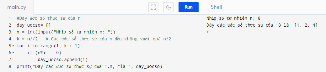 Em hãy viết chương trình nhập một số tự nhiên n và tạo một danh sách các ước số thực sự của n.