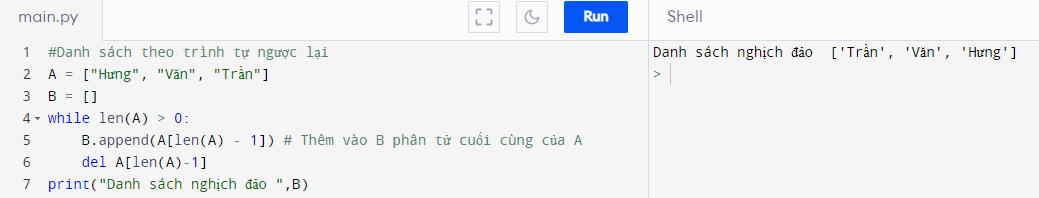 Cho một danh sách A. Viết chương trình tạo danh sách B có các phần tử là các phần tử của A theo trình tự ngược lại.