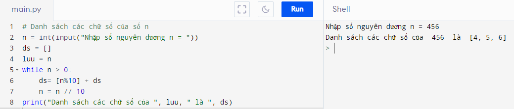 Em hãy viết chương trình tạo danh sách gồm các chữ số của một số tự nhiên n được nhập từ bàn phím.