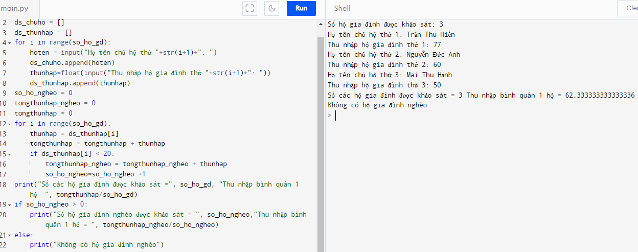 Với kết quả khảo sát tình hình thu nhập được nêu trong Câu 21.11, em hãy viết chương trình để hỗ trợ cho nhóm tổ chức khảo sát: Xác định mức thu nhập bình quân của tất cả các hộ gia đình được khảo sát; Xác định số các hộ gia đình có thu nhập dưới 20 triệu cùng thu nhập bình quân của các hộ đó.