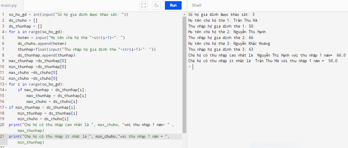 Kết quả khảo sát về tình hình thu nhập của n (n >0) gia đình được chọn ngẫu nhiên ở một địa phương được nhập từ bàn phím vào hai danh sách: danh sách thứ nhất là họ tên các chủ hộ, danh sách thứ hai là thu nhập tương ứng của từng hộ gia đình tính theo đơn vị triệu đồng. Viết các câu lệnh thực hiện việc tạo hai danh sách đó.