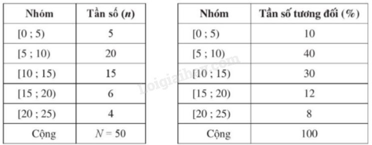 \(\frac{5}{{50}}.100\% = 10\% ;\frac{{20}}{{50}}.100\% = 40\% ;\frac{{15}}{{50}}.100\% = 30\% ;\frac{6}{{50}}.100\% = 12\% ;\frac{4}{{50}}.100\% = 8\% \)