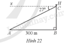 Trên mặt biển, khi khoảng cách từ ca nô đến chân tháp hải đăng là AB = 300 m, một người đứng trên tháp hải đăng đó, đặt mắt tại vị trí C và nhìn về phía ca nô theo phương CA tạo với phương nằm ngang Cx một góc là \(\widehat {ACx} = 27^\circ \) (minh hoạ ở Hình 22). Tính chiều cao BH của tháp hải đăng (làm tròn kết quả đến hàng phần trăm của mét), biết AB//Cx và độ cao từ tầm mắt của người đó đến đỉnh tháp hải đăng là CH = 2,1 m.