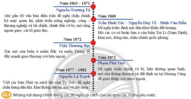 Khai thác sơ đồ 22.2, theo em, các nhà cải cách quan tâm đến những vấn đề nào nhất? Trong bối cảnh đất nước vào cuối thế kỉ XIX, em có đồng ý với những đề xuất đó không? Tại sao?