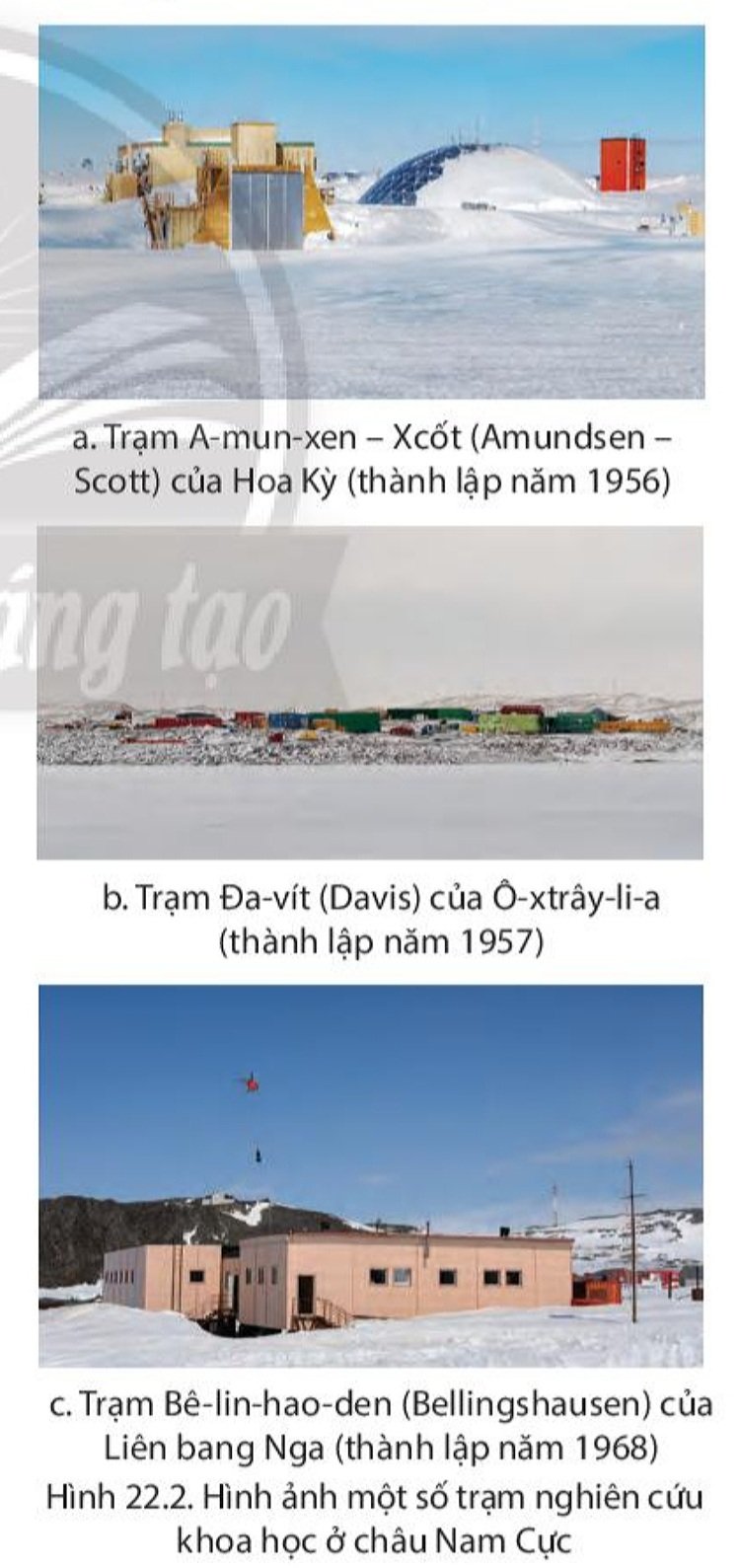 - Một số trạm nghiên cứu của các quốc gia ở châu Nam Cực: trạm A-mun-xen – Xcốt, trạm Đa-vít, trạm Bê-lin-hao-đen,…
