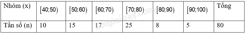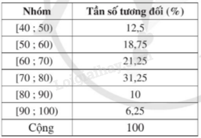 Tỉ số phần trăm của mỗi nhóm \(\left[ {40;50} \right),\left[ {50;60} \right),\left[ {60;70} \right),\left[ {70;80} \right),\) \(\left[ {80;90} \right),\left[ {90;100} \right)\) lần lượt là: