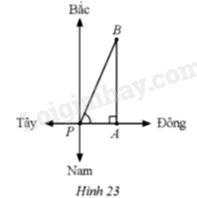 Một thuyền đi với tốc độ 20km/h theo hướng Đông trong 1 giờ 30 phút từ vị trí P đến vị trí A. Sau đó nó sẽ đi theo hướng Bắc với cùng tốc độ trong 3 giờ 30 phút đến vị trí B (Hình 23). Tính góc so với hướng Đông mà thuyền đi từ vị trí P đến vị trí B (làm tròn kết quả đến hàng đơn vị của phút).