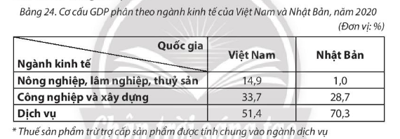 Trong cơ cấu GDP phân theo ngành kinh tế của Việt Nam và Nhật Bản, năm 2020 có sự khác nhau giữa các ngành: