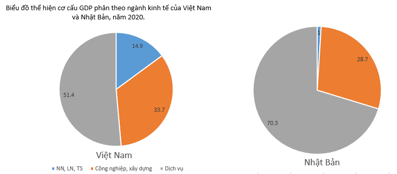 - Trong cơ cấu kinh tế tỉ trọng ngành dịch vụ của Nhật Bản cao hơn Việt Nam, ngành công nghiệp, xây dựng và dịch vụ Việt Nam có tỉ trọng cao hơn so với Nhật Bản.