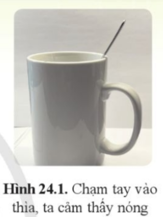 Đặt một chiếc thìa vào cốc nước nóng (hình 24.1). Một lúc sau chạm tay vào thìa, ta cảm thấy nóng. Điều gì đã thay đổi ở chiếc thìa mà nhiệt độ của thìa tăng lên?
