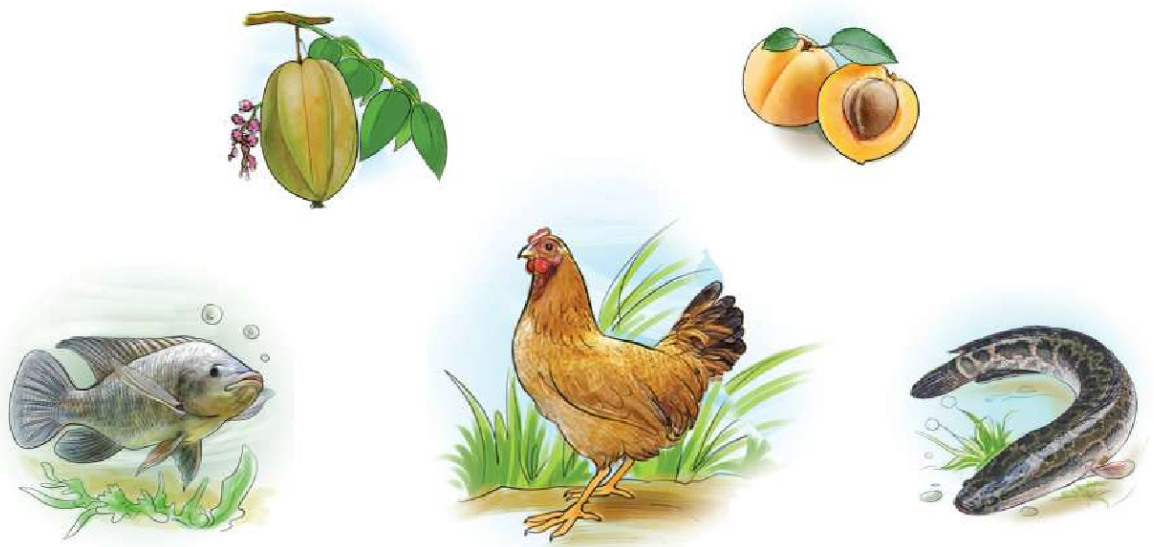 Bà cho nhà Quế quà gồm khế, mơ, cá rô, cá quả, gà ri.