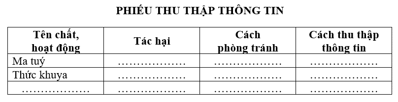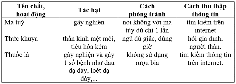 Viết vào chỗ (…) các thông tin về chất, hoạt động có hại đối với các cơ quan tiêu hoá, tuần hoàn, thần kinh mà em thu thập được.