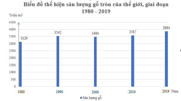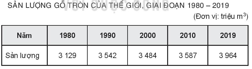 - Nhận xét: Giai đoạn 1980 - 2019, sản lượng khai thác gỗ trên thế giới có sự biến động: xu hướng tăng trong giai đoạn 1980 - 1990 (tăng 413 triệu m3), xu hướng giảm trong giai đoạn 1990 - 2000 (giảm 58 triệu m3), sau năm 2000 có xu hướng tăng trở lại.