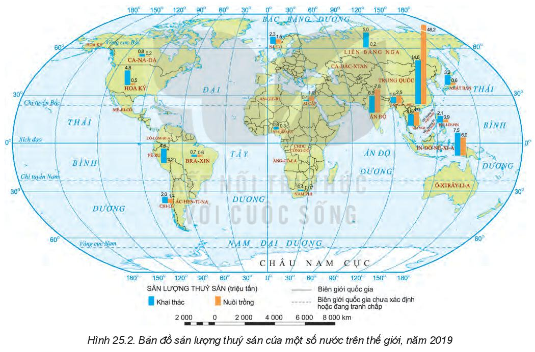 Dựa vào kiến thức về tình hình khai thác thủy sản thế giới và quan sát biểu đồ hình 25.2 (biểu đồ cột xanh)