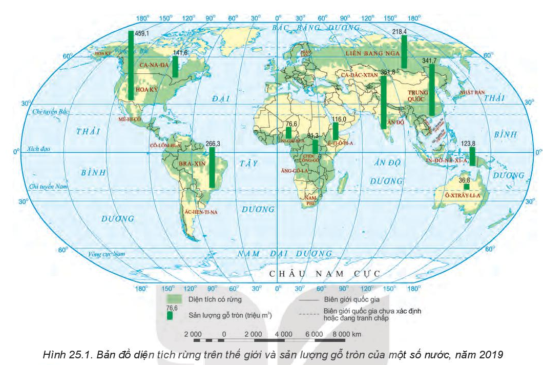 Dựa vào hình 25.1, đọc chú thích để xác định các quốc gia có sản lượng gỗ tròn khai thác trên 200 triệu m3 (biểu đồ cột đơn)