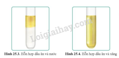 Quan sát các hình 25.3 và 25.4, nêu nhận xét về khả năng hòa tan của chất béo trong nước, xăng