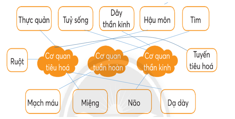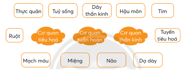 Nối tên các bộ phận sao cho phù hợp với cơ quan tiêu hoá, tuần hoàn, thần kinh.