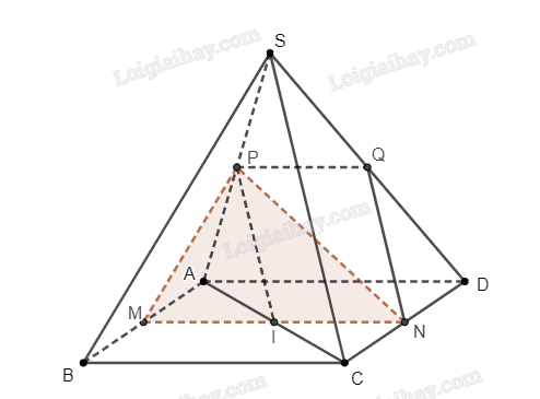 b) Gọi \(Q\) là trung điểm của \(SD\). Ta chứng minh được \(NQ\parallel SC\). Do hai mặt phẳng \(\left( {MNP} \right)\) và \(\left( {SCD} \right)\) chứa hai đường thẳng song song \(PI\) và \(SC\), nên giao tuyến của chúng cũng sẽ song song với hai đường thẳng này.