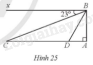 Từ một đài quan sát, một người đặt mắt tại vị trí B. Người đó nhìn thấy một chiếc ô tô ở vị trí C theo phương BC tạo với phương nằm ngang Bx một góc là (widehat {CBx} = 23^circ )với Bx // AC. Khi đó, khoảng cách giữa ô tô và chân đài quan sát là AC = 1284 m. Nếu ô tô từ vị trí C tiếp tục đi về phía chân đài quan sát với tốc độ 60 km/h thì sau 1 phút, người đó nhìn thấy ô tô ở vị trí D với góc (widehat {DBx} = alpha ^circ ) (Hình 25).a) Tính chiều cao của đài quan sát (làm tròn kết quả đ