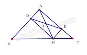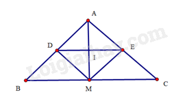 Mà \(I\) là trung điểm của \(DE\), suy ra \(I\) là trung điểm của \(AM\). Vậy ba điểm \(A < I,M\) thẳng hàng.