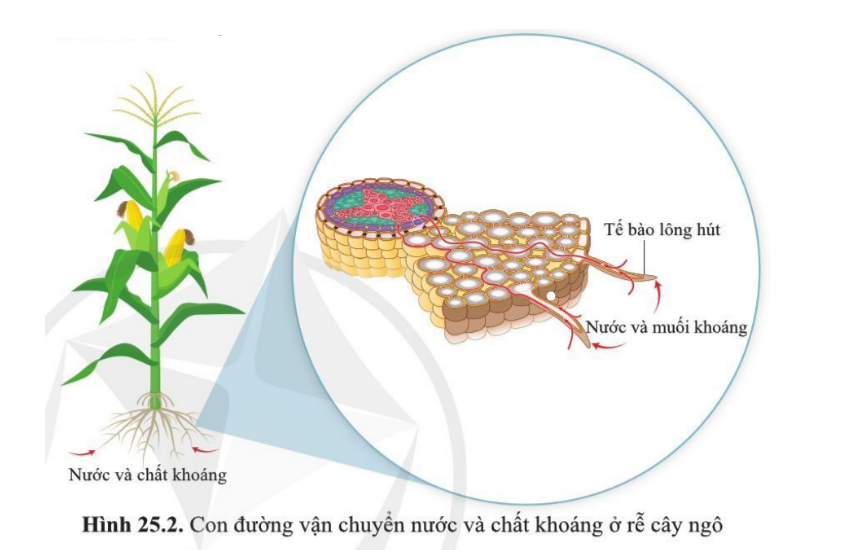 Câu hỏi Quan sát hình 25.2, nêu con đường hấp thụ và vận chuyển nước từ đất vào trong rễ.