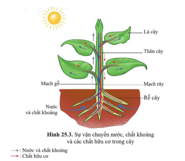 - Quan sát hình 25.3 và nêu các chất được vận chuyển trong mạch gỗ và mạch rây.