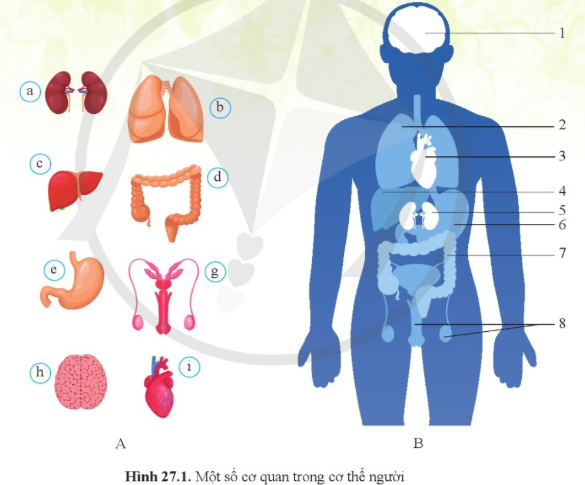 | Nêu tên các cơ quan ở hình 27.1A và cho biết các cơ quan đó có vị trí trong cơ thể tương ứng với số nào ở hình 27.1B |